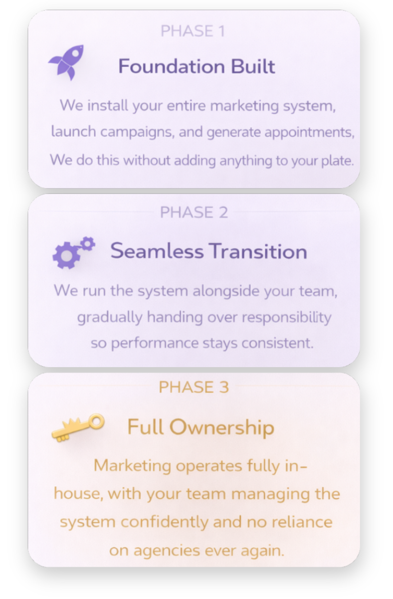 In 90 days we set up the systems and train you or your team to own marketing in-house.